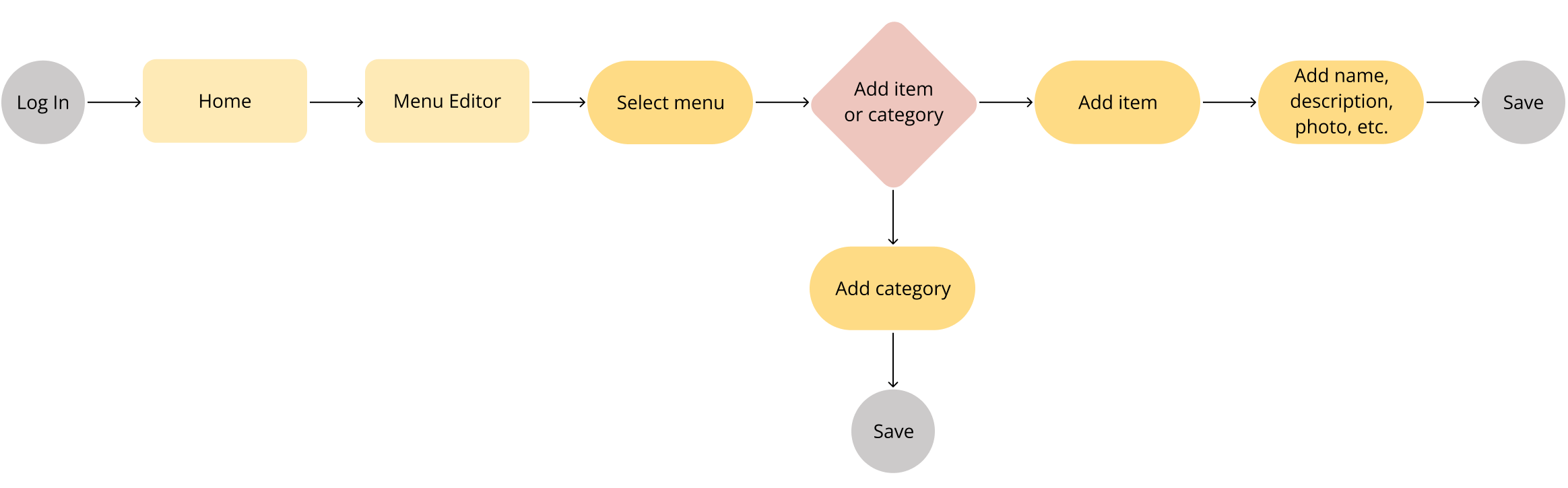 To help determine the focus of our wireframes, she also created a user flow for adding a menu item or category in the dashboard.